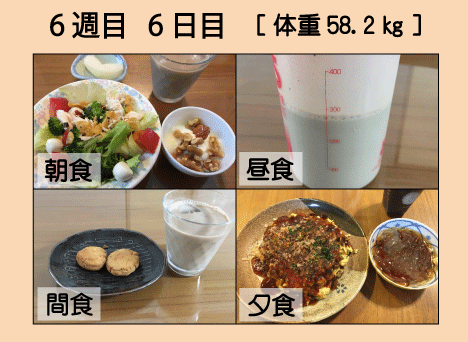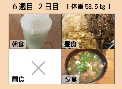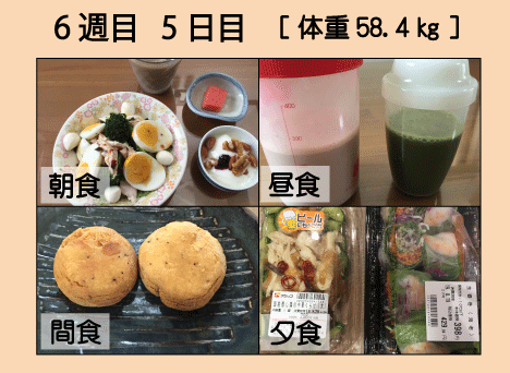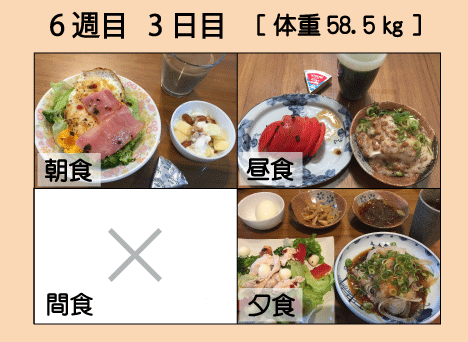 スタート時の体重は62kgなので、6週間で合計3.4kg減量です。